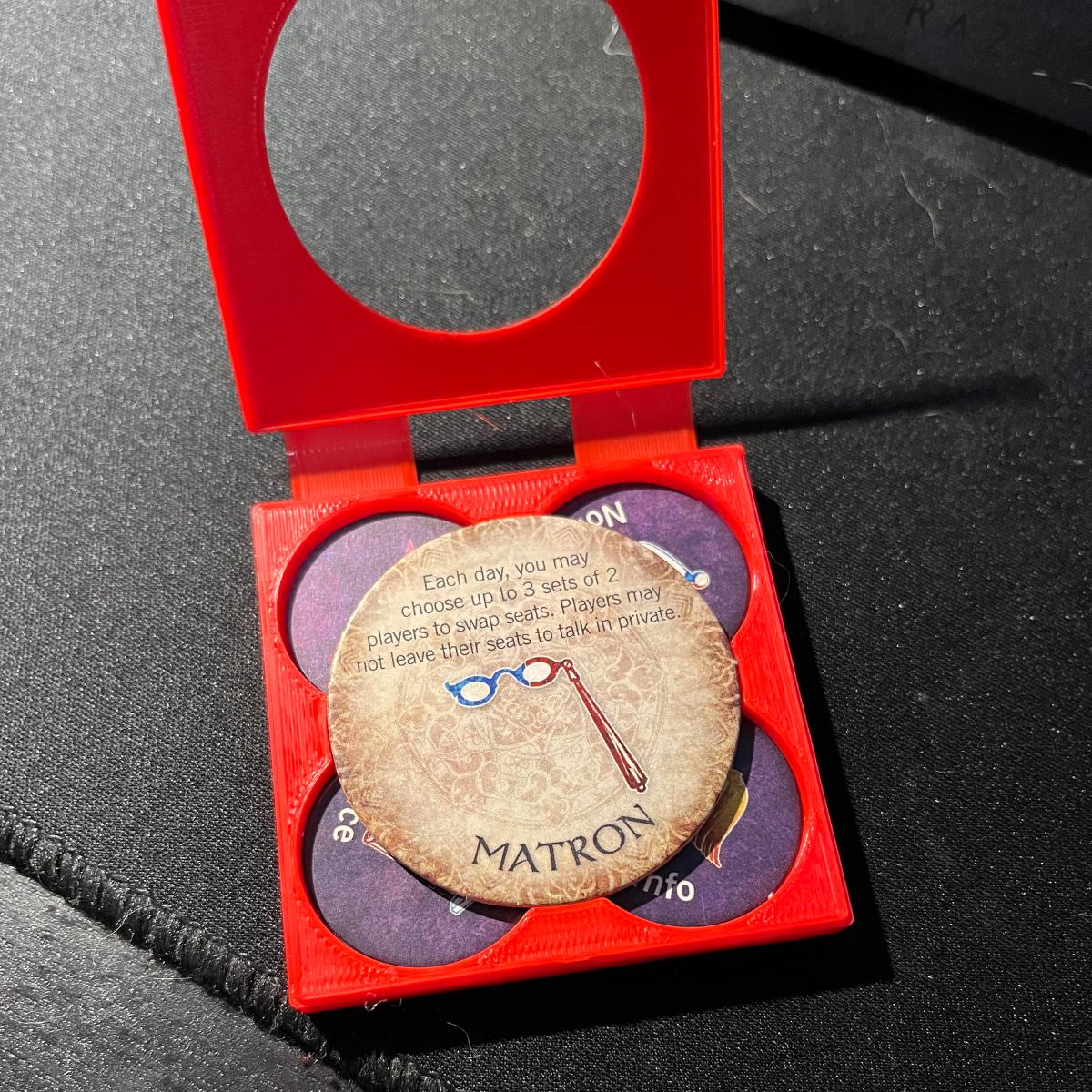 I got tired of having to open up multiple script boxes just to fish out the character tokens I needed for a custom script game. So I designed a “compact” character library where each character gets their own little box, including their reminder tokens!